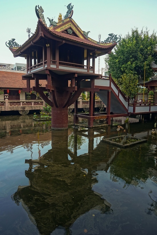Du khách sẽ bắt gặp hình ảnh ngôi chùa nhỏ xây trên một chiếc cột ngay từ khi bước qua cổng chùa. Cây cột này cao khoảng 12 m, còn diện tích mặt hồ là 600 m2. Hồ nước này có còn có tên Long Nhãn, tức hồ mắt rồng. Ảnh: Quỳnh Trần.