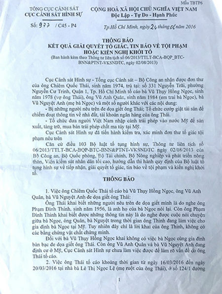 Đến cuối tháng 6/2016, Cục Cảnh sát hình sự - Bộ Công an ra thông báo cho rằng những nội dung tố cáo của ông Chiêm Quốc Thái là không có căn cứ. Sau vụ việc đó, bà Ngọc vẫn tiếp tục có những động thái gây rối ông Thái bằng nhiều cách và đến nay tổ chức thuê giang hồ để truy sát ông như đã thông tin.