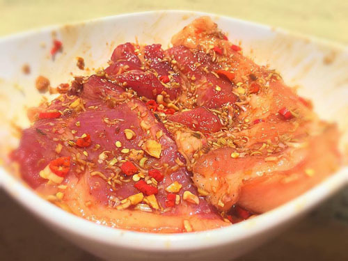 - Sả, tỏi, ớt băm nhỏ đập nhuyễn. Sau đó cho vào ướp với thịt cùng 1 thìa hạt tiêu và chút dầu hào, 1/2 thìa cafe mắm tôm, 1 thìa cafe bột màu điều, vài lá mắc mật sấy khô tán nhuyễn.