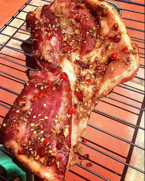 - Ướp 30 phút rồi mang phơi nắng. Sau 1,5 giờ lật mặt thịt một lần. Cứ vậy cho đến khi thịt săn lại như mình muốn thì mang vào để nguội. Trên hình là thành phẩm phơi nắng sau 5 tiếng. Nếu bạn muốn ăn phần bì giòn thì chỉ cần phơi đến khi gõ vào da thấy cộc cộc là được. Tuỳ vào độ nắng to hay nhỏ mà phơi có thể 1-2 nắng.
