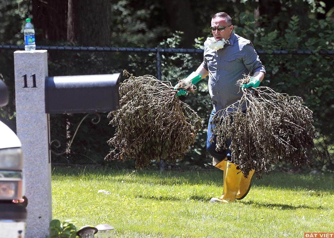 Một cảnh sát viên đang khiêng mấy cần sa từ ngôi nhà nằm trên đường Herbert Street tại Tewksbury ngày thứ Hai, 11 tháng 6, 2018. (Matt Stone/Boston Herald)
