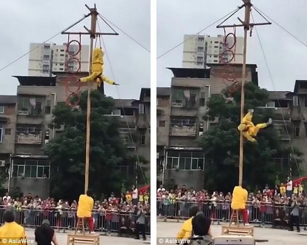 Theo hình ảnh ghi lại được, khi đang biểu diễn màn nhào lộn trên 1 chiếc cột có độ cao 10m, nghệ sĩ này đã không sử dụng bất cứ thiết bị an toàn nào hỗ trợ, nên khi sợi dây thừng bị tuột ra khỏi chân, anh bị rơi thẳng xuống đất. Một người đồng nghiệp đã cố gắng bắt lấy anh nhưng không kịp, sau đó nhiều người khác đã chạy tới đỡ nam diễn viên dậy.