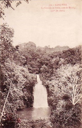Thác Liên Khương ở cạnh ngã ba Liên Khương, cách Đà Lạt khoảng 30 km. Ảnh chụp vào thập niên 1920.