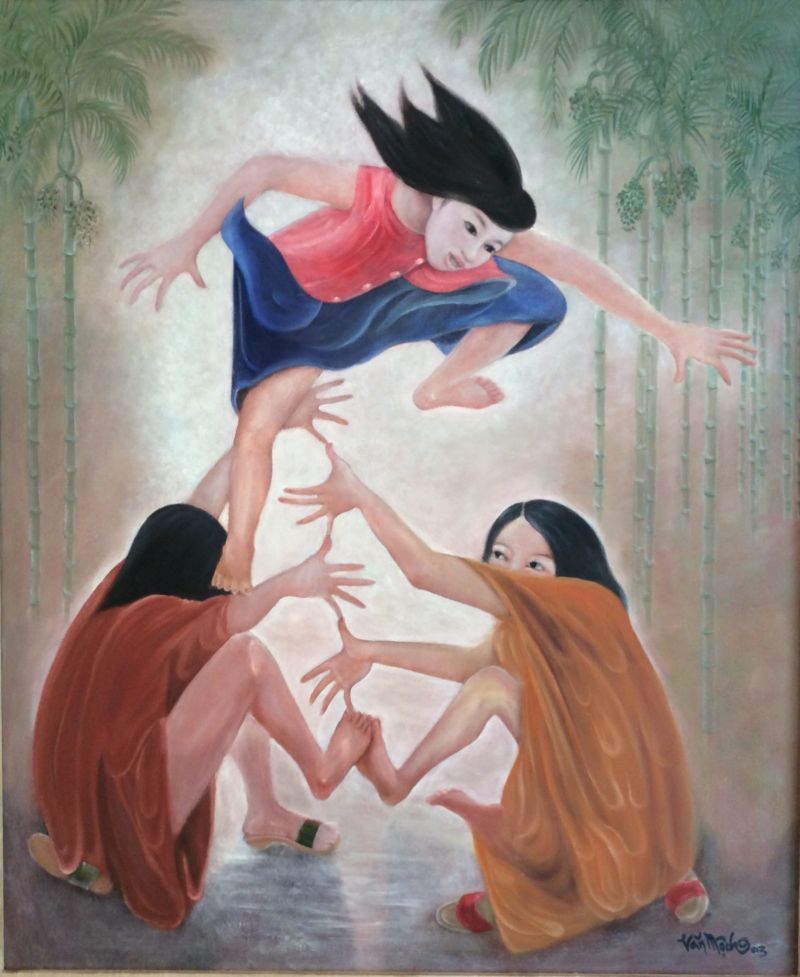 “Trồng Nụ, Trồng Hoa,” tranh của họa sĩ Văn Mộch. (Hình: Viet Art Group cung cấp)