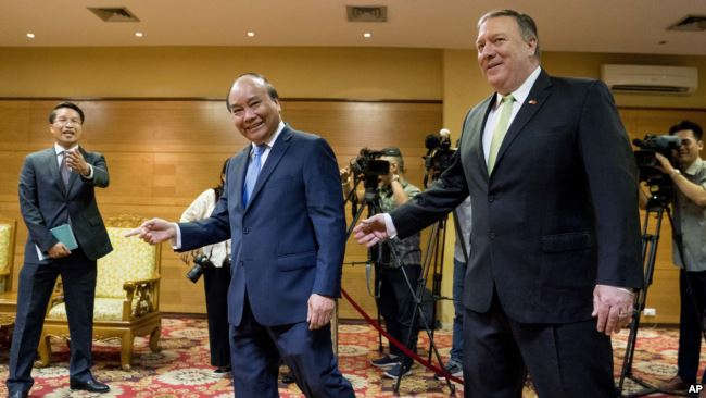 Ngoại trưởng Mỹ Mike Pompeo (phải) gặp Thủ tướng Việt Nam Nguyễn Xuân Phúc tại Hà Nội hôm 9/7/2018.