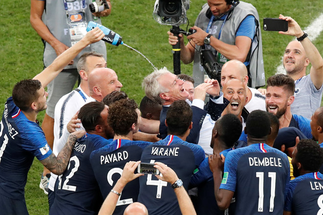 Các cầu thủ đội tuyển Pháp tri ân HLV Didier Deschamps bằng cách tung ông lên. Deschamps là người hùng thật sự của "Les Bleus" khi giúp đội nhà có lần thứ hai trong lịch sử vô địch World Cup.