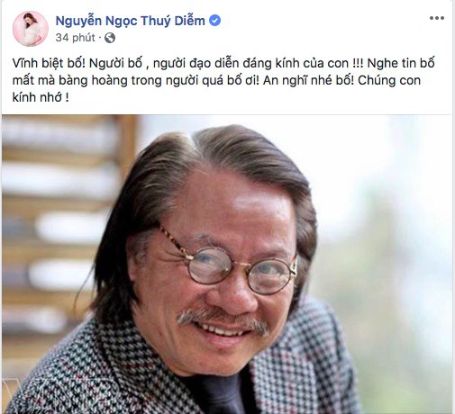 Dù không muốn, vẫn phải nói lời vĩnh biệt anh. Anh về nơi đó với thầy, rồi thầy trò lại mở lớp đàm đạo về cái đẹp và cái nhân nghĩa vĩnh hằng trong cuộc sống. Anh mãi luôn là người anh cả hiền hậu, tài năng của lớp diễn viên điện ảnh khoá 2 ngày ấy. Anh đi lòng thanh thản nhẹ tựa lông hồng. Khóc thương tiếc anh trong một ngày đầu thu" - nữ diễn viên viết.
