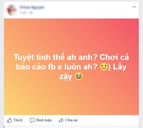 Sau khi mọi chuyện vỡ lở, cách đây 8 giờ, C.N còn tố H.T tuyệt tình vì report Facebook của cô.