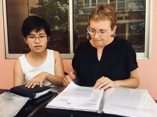 Bà Agnès Munier-Michel (phải) ngồi tại ban công khách sạn ở quận Tân Bình hôm 2/8 lật giở tập hồ sơ điều trị bệnh não úng thủy của con gái Tường Vy Munier-Michel. Ảnh: Hạnh Phạm.