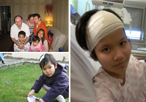 Tường Vy Munier-Michel (phải) sau ca mổ năm 2014, hồi 4 tuổi (phải, dưới) và chụp cùng cha mẹ người Pháp và các anh chị em. Ảnh: NVCC.