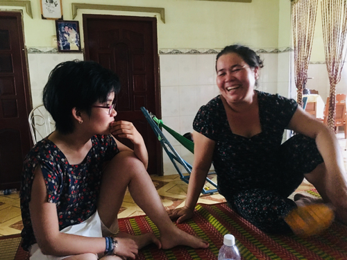Tường Vy Munier-Michel (trái) ngồi nói chuyện với mẹ Khổng Thị Thu Trang tại nhà ở ấp Phú Long, xã phú Ngãi, huyện Ba Tri, tỉnh bến Tre hôm 4/8. Ảnh: Hạnh Phạm.