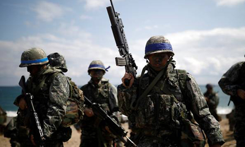 Thủy quân lục chiến Hàn Quốc tham gia một chiến dịch đổ bộ chung với quân đội Mỹ vào ngày 2/4/2017. Ảnh: Reuters.