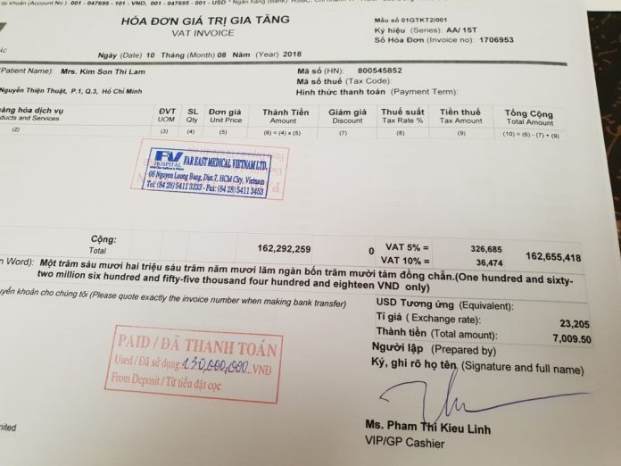 Hóa đơn bệnh viện FV Hospital của bà Kim Sơn ở Việt Nam