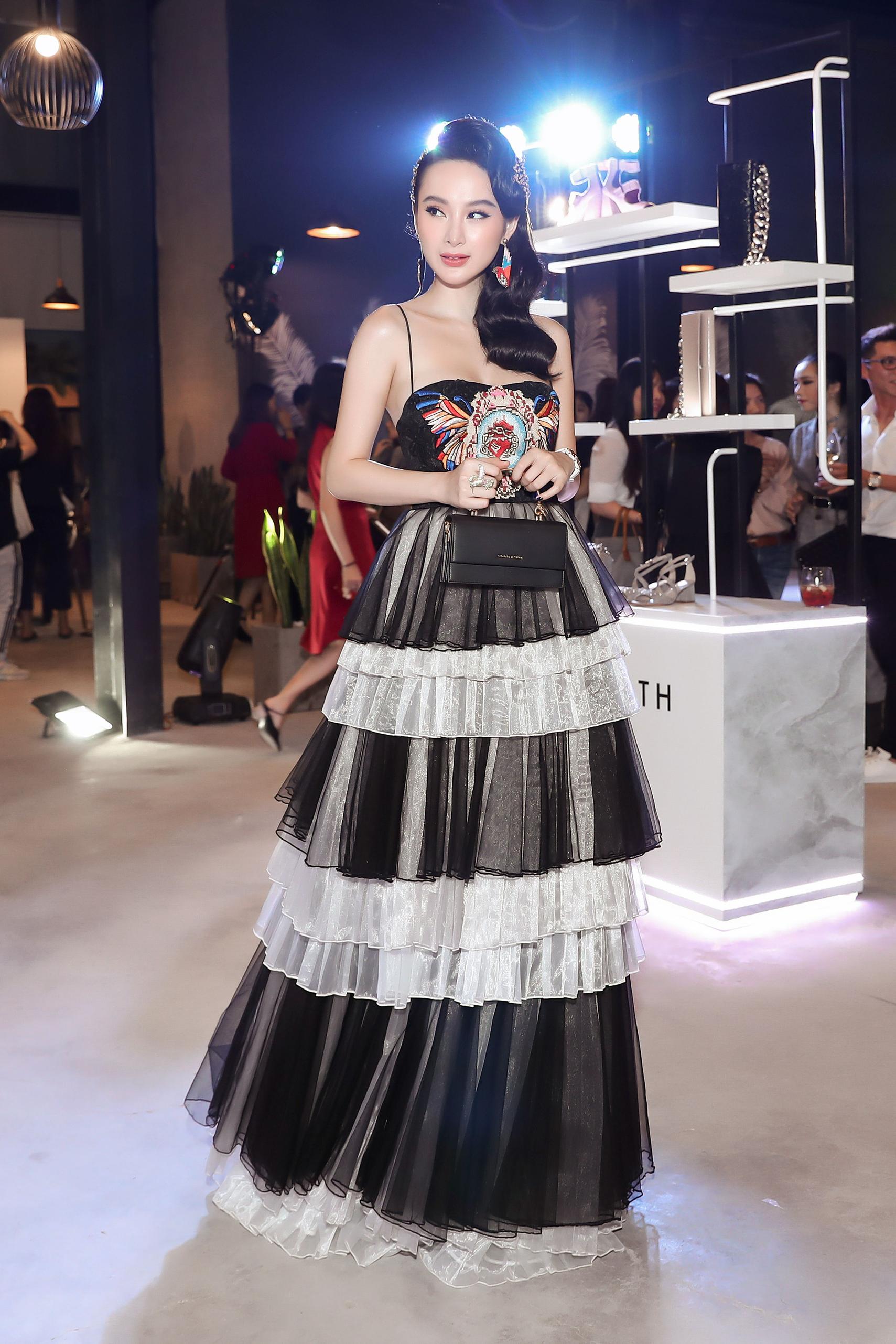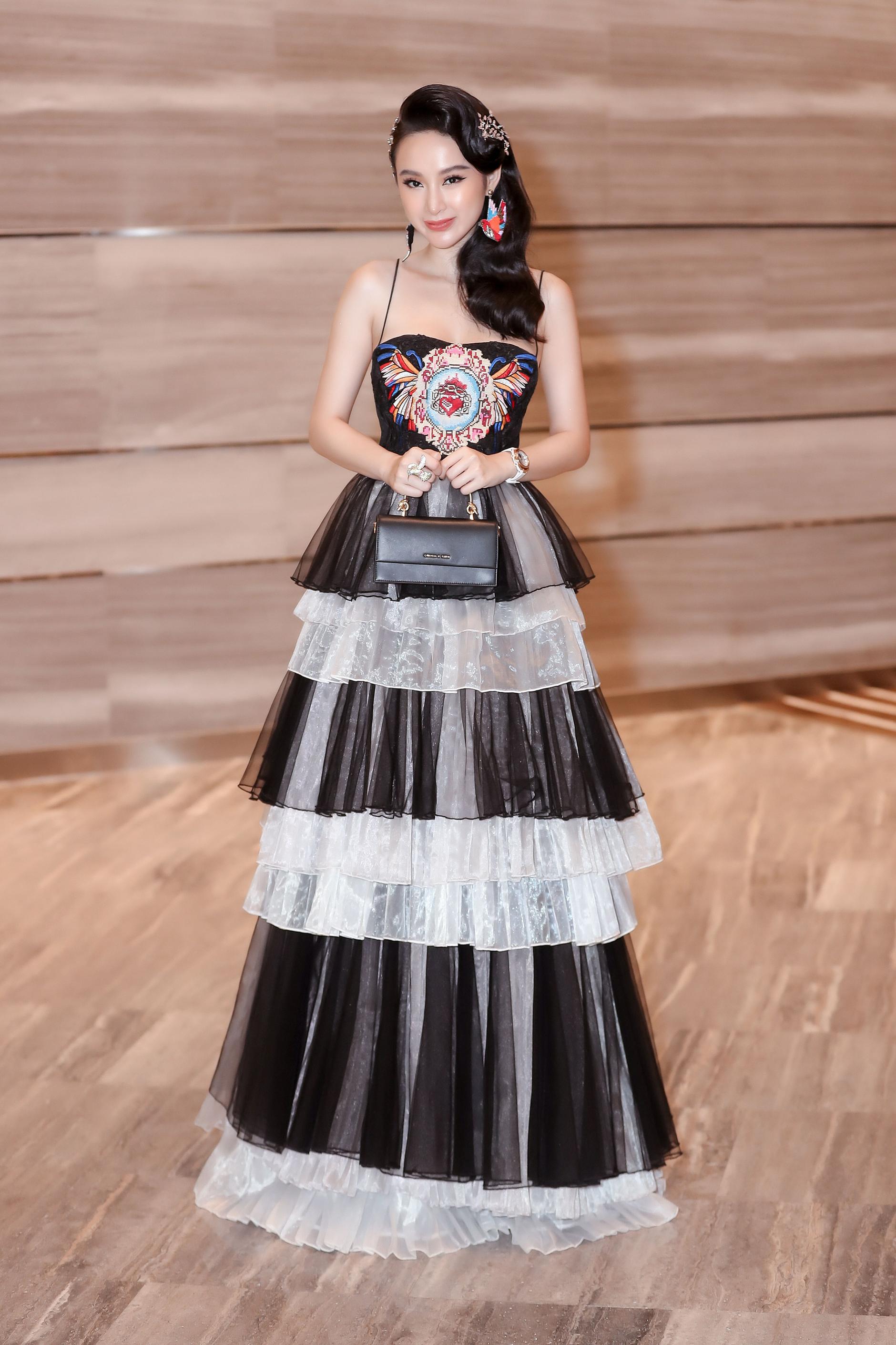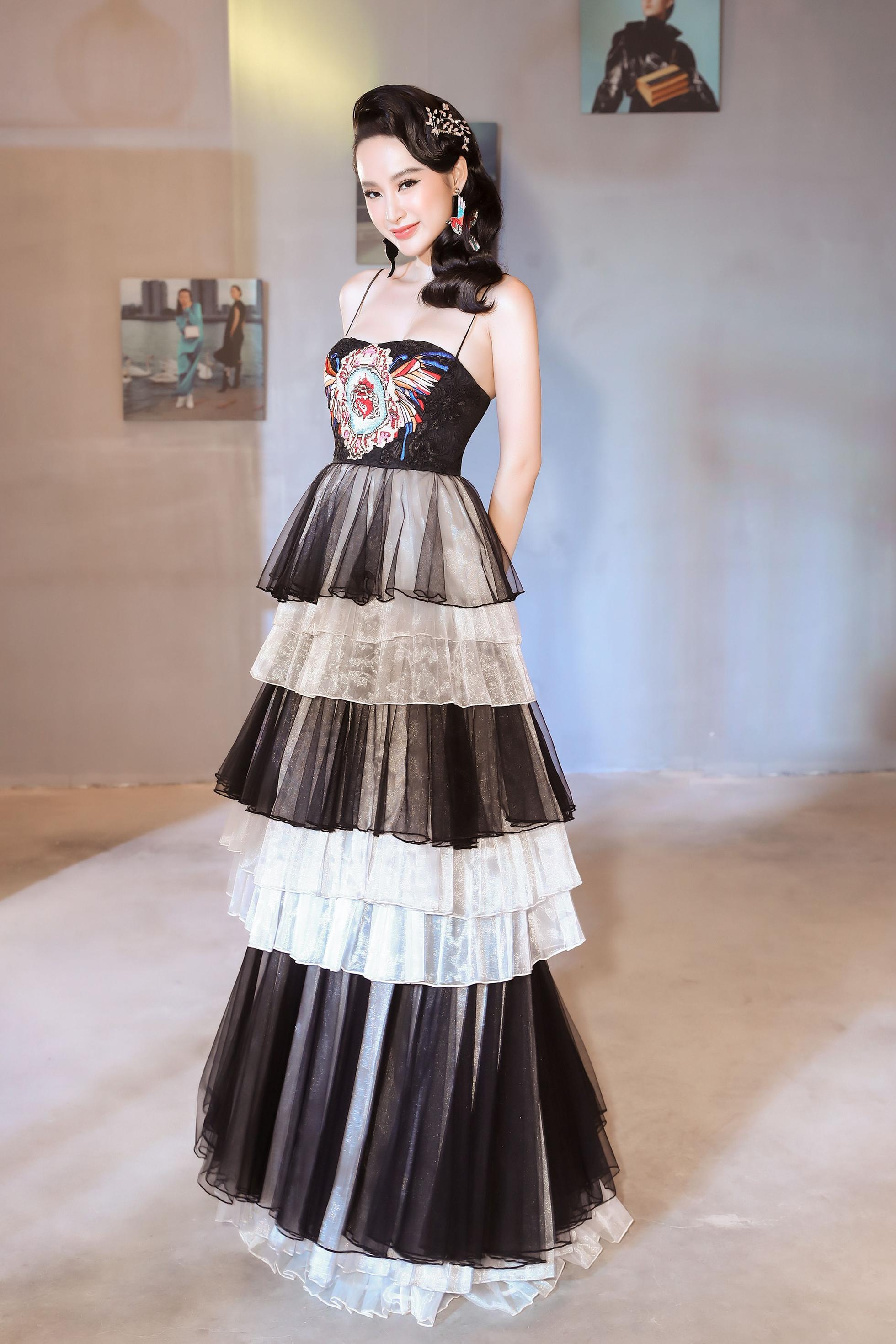 Angela Phương Trinh xuất hiện với chiếc váy xếp tầng màu đen trắng ấn tượng.
