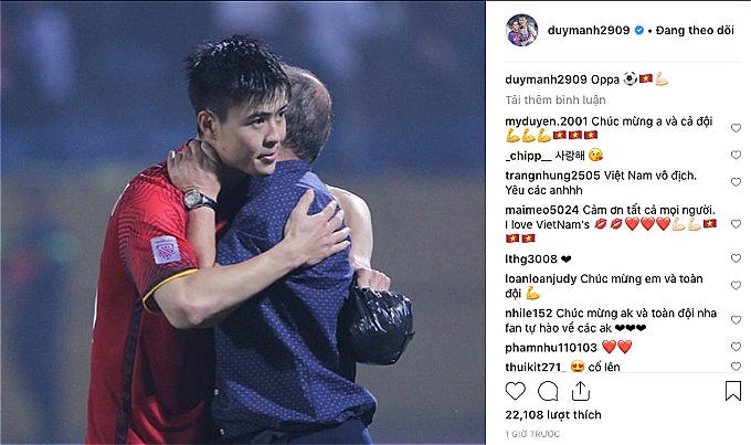 "Oppa", Duy Mạnh đăng ngắn gọn trên trang cá nhân, bên cạnh là bức hình anh ôm HLV Park Hang-seo sau trận thắng Campuchia 3-0.