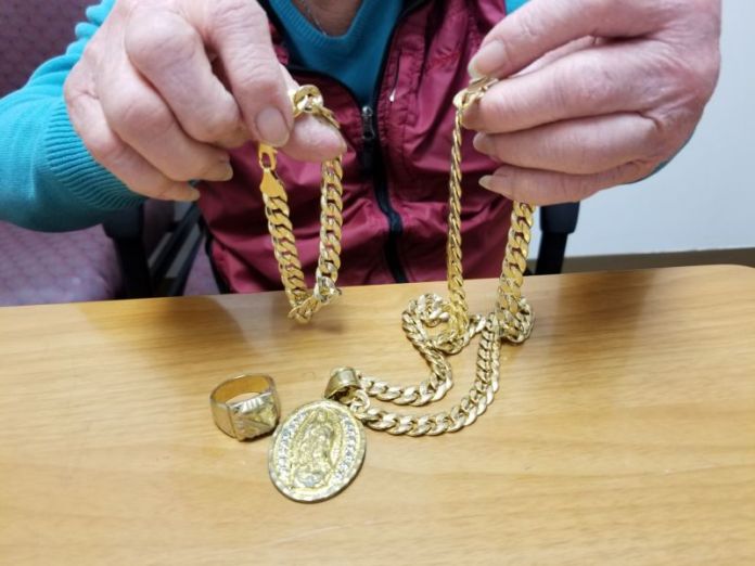 Dây chuyền, lắc, cà rá bằng vàng giả mà bọn lừa đảo đưa cho bà Năm Hưng. (Hình: Ngọc Lan/Người Việt)
