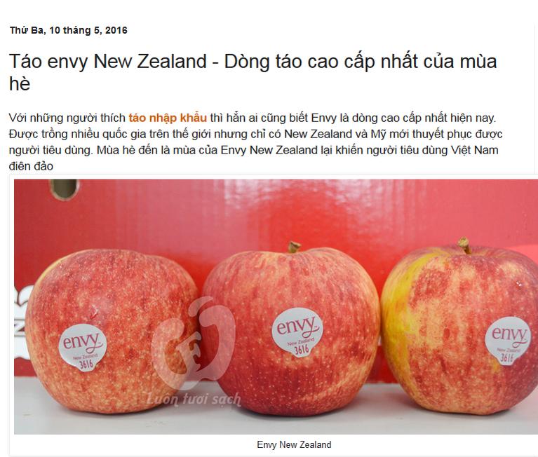 Mới đây thị trường Việt Nam đang sốt loại táo "khủng" của Mỹ, có tên là Envy, giá bán từ 9 USD / KG trở lên. Táo khá to và ngon trở thành hàng sốt tại Sài Gòn, Hà Nội. Với giá không hề rẻ, nhưng người Việt rất chịu khó mua về ăn để không kém người Mỹ.