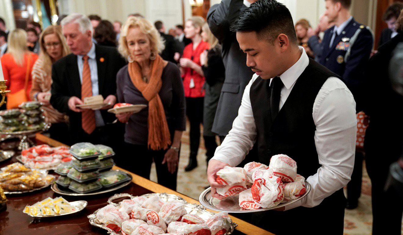 Chính phủ đóng cửa, các đầu bếp Nhà Trắng đã nghỉ không lương 24 ngày qua. Vì thế, để đãi khách, Tổng thống Donald Trump đã phải bỏ tiền túi ra mua đồ ăn. Các món ông đãi các cầu thủ bóng bầu dục tới dự tiệc là những món đồ ăn nhan.