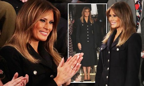 Khi đến nghe Thông điệp liên bang của chồng, đệ nhất phu nhân Mỹ diện áo khoác dài màu xanh đen trị giá gần 2.000 USD theo phong cách quân đội, tay chỉ đeo một chiếc găng.