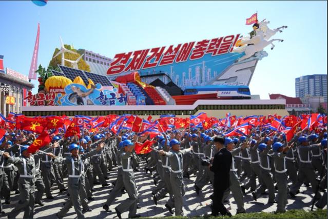 Chủ đề phát triển kinh tế được thể hiện trong màn diễu hành của các công nhân Triều Tiên (Ảnh: Reuters)