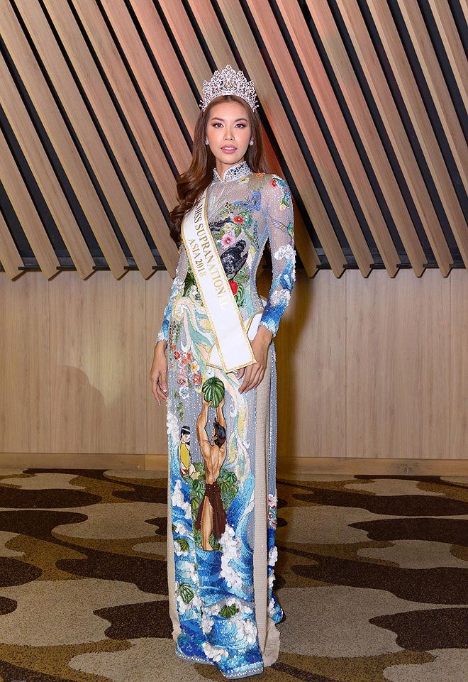 Minh Tú - đại diện Việt Nam tại cuộc thi Hoa hậu Siêu quốc gia 2018 xuất hiện duyên dáng nhưng không kém phần nổi bật trong tà áo dài truyền thống.