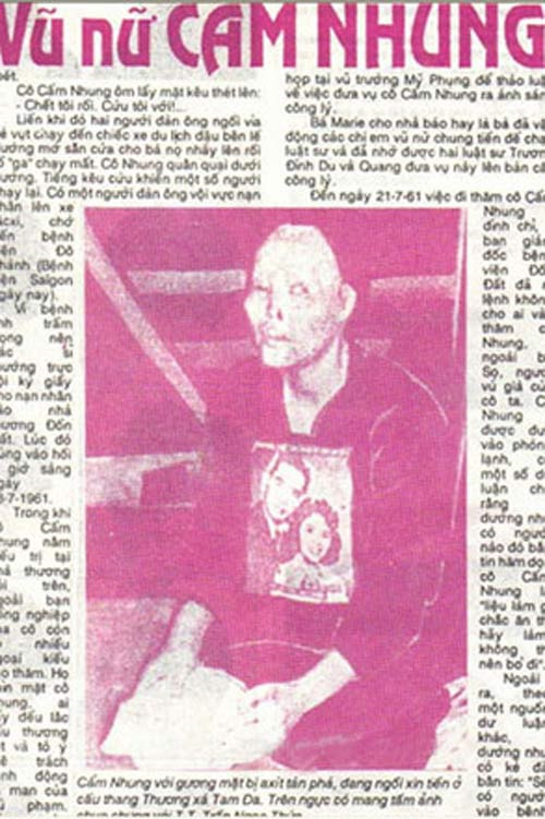 Lại nói về Cẩm Nhung, ca axít đậm đặc đă phá hủy toàn bộ khuôn mặt của cô vũ nữ, đôi mắt của nạn nhân cũng bị bỏng rất nặng. Các bệnh viện ở Sài G̣n đều bó tay, chỉ có thể cứu được mạng sống của Cẩm Nhung, c̣n đôi mắt, khuôn mặt th́ không thể cứu chữa.