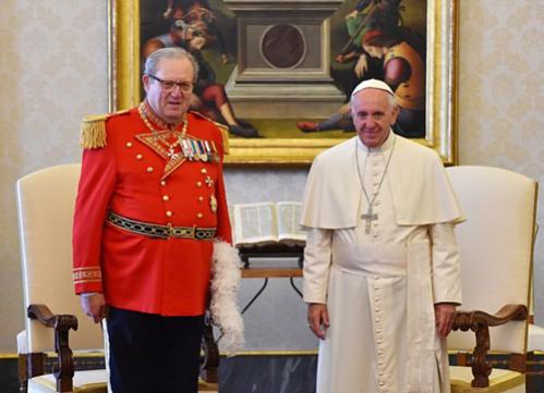 Giáo Hoàng Francis (phải) chụp ảnh cùng Hoàng tử, Đại hiệp sĩ của Dòng chiến sĩ toàn quyền Malta, Matthew Festing. Ảnh: Mirror.
