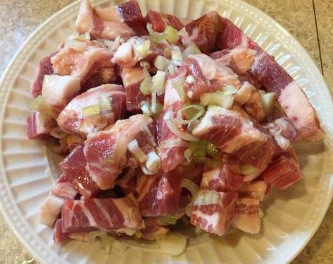 Bước 1: Thịt lợn vai cắt thành từng khối rửa sạch với nước muối loăng rồi để ráo nước. Đem ướp cùng với 1 muỗng cà phê nước mắm, 1 muỗng cà phê hạt nêm và hành khô thái mỏng