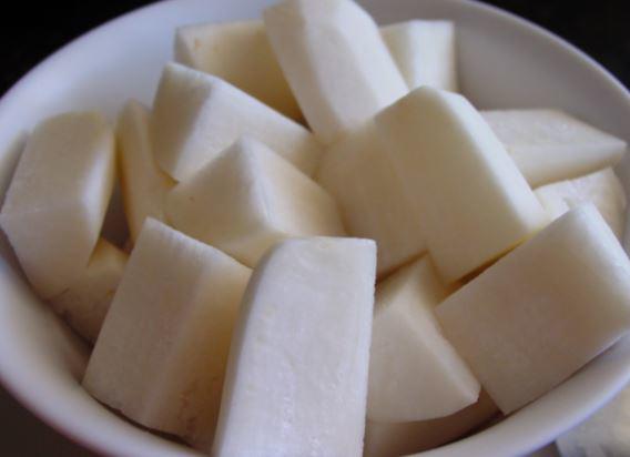 Bước 2: Củ cải nạo bỏ vỏ, rửa sạch và cắt thành từng khúc vừa ăn. Sau đó đem xóc củ cải cùng với một chút muối.