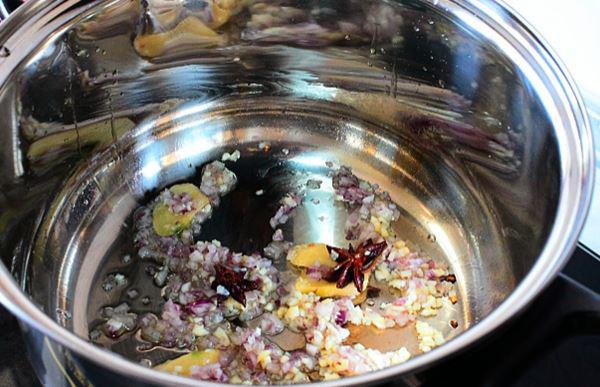 Bước 3: Cho 1 muỗng canh dầu ăn cùng với 2 th́a đường lên bếp nấu đến khi đường chuyển thành màu cánh gián th́ thêm gừng, tỏi, hành khô và hoa hồi vào xào cho đến khi thơm.
