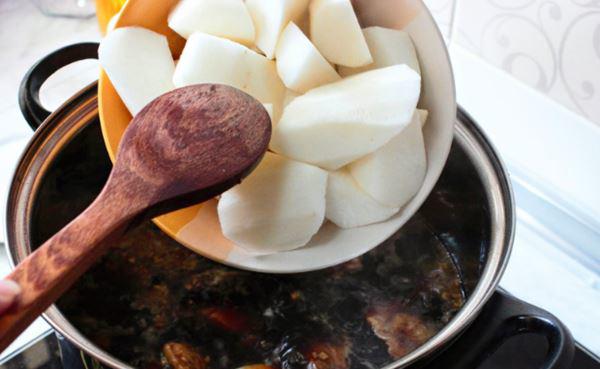Bước 8: Cho toàn bộ củ cải vào nồi đậy nắp và đun đến khi sôi sau đó hạ nhiệt đun liu riu trong 30 phút hoặc cho đến khi tất cả các thành phần đă chín mềm.