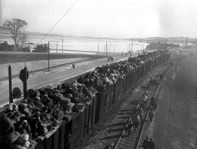 Hàng dài người tỵ nạn trong cuộc chiến tranh Triều Tiên chen chúc nhau trên những đoàn tàu hỏa. Nguồn ảnh: Foto.