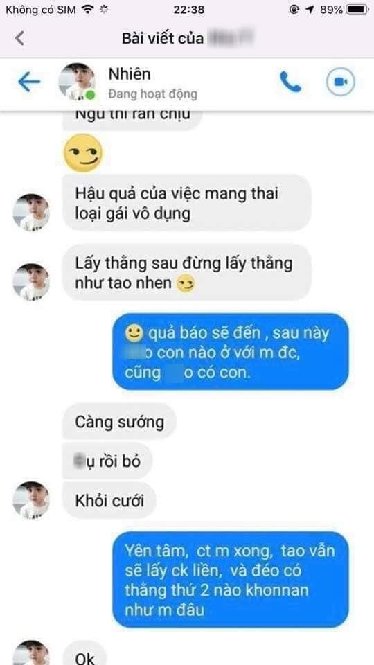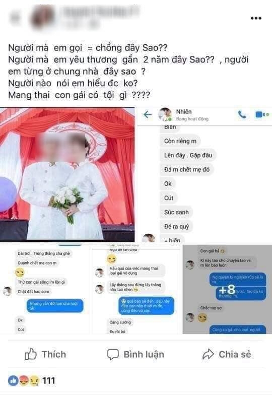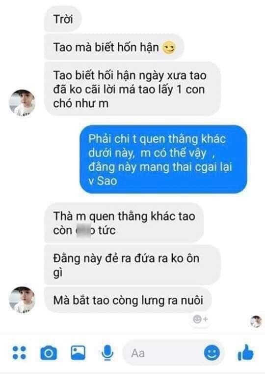 Bàng hoàng trước lời lẽ mất nhân tính của chồng, H.T.N.Y đăng status than trời: “Người mà em gọi bằng chồng đây sao? Người mà em yêu thương gần 2 năm đây sao? Người em từng ở chung nhà đây sao? Người nào nói em hiểu được không? Mang thai con gái có tội gì?”. Kèm theo đó, cô cung cấp những tin nhắn đáng ghê tởm của N.H.N.