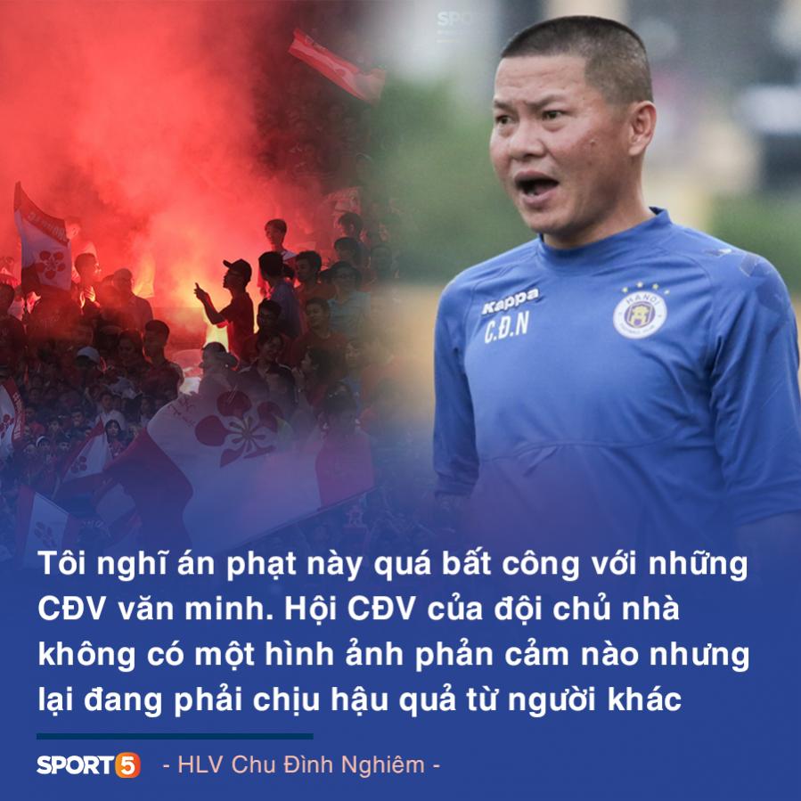 HLV Chu Đình Nghiêm chia sẻ: "Tôi nghĩ án phạt này quá bất công với những CĐV văn minh. Nếu có một hành động dù nhỏ, trong Hội CĐV của Hà Nội FC liên quan đến pháo sáng, sau đó có án kỷ luật thì tôi đồng ý. Thế nhưng, đây là trận đấu Hội CĐV của đội chủ nhà không có một hình ảnh phản cảm nào nhưng lại đang phải chịu hậu quả từ người khác".