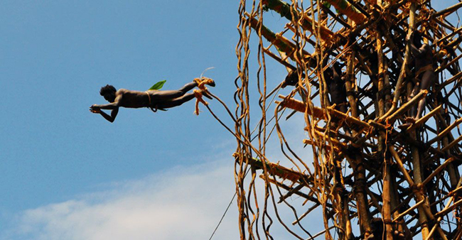 Trên đảo Ngũ Tuần của Vanuatu, một nghi lễ được thực hiện bởi những người đàn ông được cho là để đảm bảo một vụ mùa bội thu là nhảy xuống từ những tòa tháp gỗ cao khi quấn dây quanh mắt cá chân. Họ tin rằng nếu thực hiện thử thách này an toàn là dấu hiệu cải thiện thể chất của người đàn ông, đồng thời mang lại may mắn cho mùa thu hoạch mới.