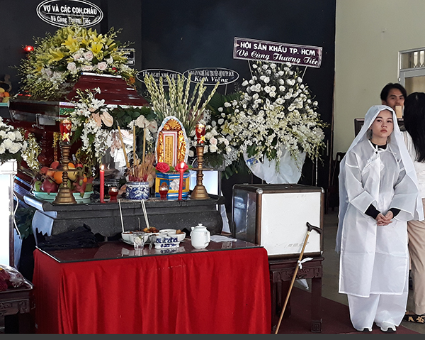Con gái nghệ sĩ Lê Bình bần thần bên linh cữu của cha. Ảnh: Hoài Sương.