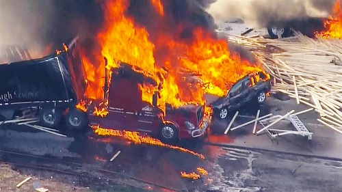 Các xe bốc cháy trong vụ tai nạn thảm khốc hôm 25/4. Ảnh: NBC News