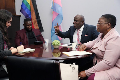Yonly (phải) ngồi cùng với các nhà hoạt động người Liberia Kamaty Diahn (bên cạnh) và Mục sư Moses Punni (thứ hai bên trái) trao đổi về cuộc vận động thành viên quốc hội trên Điện Capitol. Ảnh: Reuters.