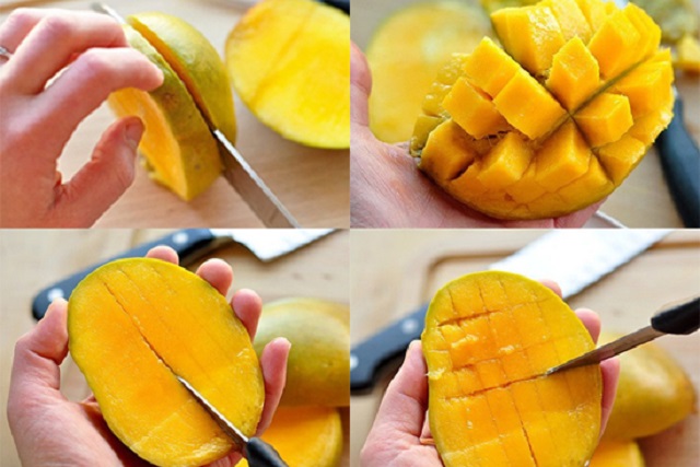 Sau khi cắt xong lộn chúng lên các miếng xoài sẽ tách ra như trong hình, có thể dùng dao cắt ra đĩa hoặc ăn luôn.