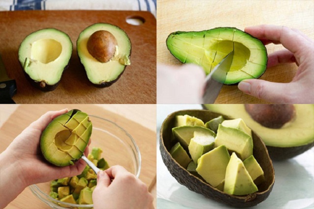 Dùng dao nhọn khứa vào ruột bơ thành các miếng nhỏ vuông, sau đó dùng thìa lấy bơ ra. Có thể trang trí bơ ra dĩa hoặc cho lại vào vỏ.