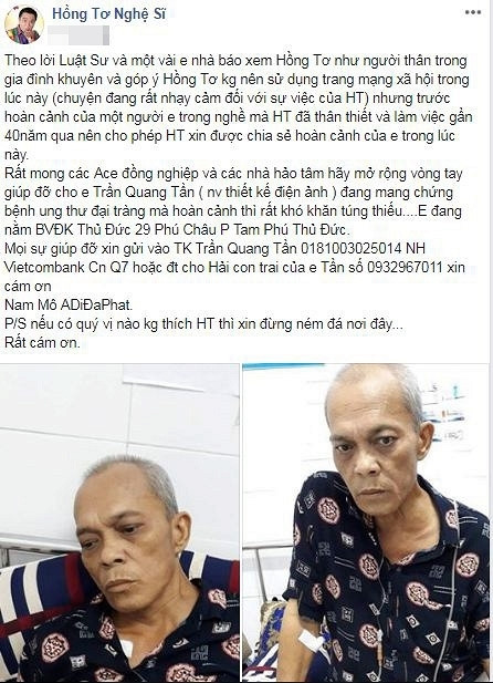 Rất mong các anh chị em đồng nghiệp và các nhà hảo tâm hãy mở rộng vòng tay giúp đỡ cho em Trần Quang Tần (nhân viên thiết kế điện ảnh) đang mang chứng bệnh ung thư đại tràng mà hoàn cảnh thì rất khó khăn túng thiếu... Em đang nằm Bệnh viện đa khoa Thủ Đức 29 Phú Châu, Phường Tam Phú, Thủ Đức... Nếu có quý vị nào không thích Hồng Tơ xin đừng ném đá nơi đây. Rất cám ơn".