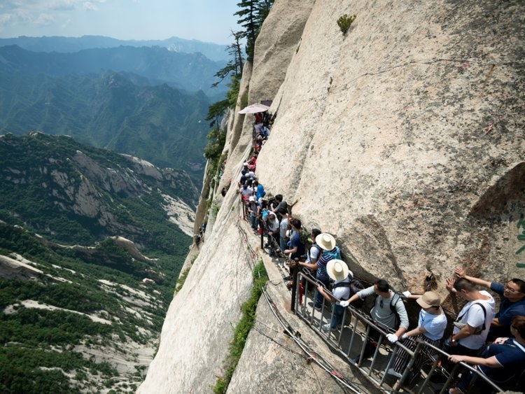 Đường đi bộ trên núi Hóa Sơn (Trung Quốc) được đặt nhiều biệt danh như “Nấc thang lên thiên đường, địa ngục chỉ cách một bước”, “Đường mòn nguy hiểm nhất hành tinh”, “Con đường ván gỗ trên bầu trời”... Du khách đi bộ qua những tấm ván mỏng được bắt vít vào sườn núi ở độ cao 2.133m. Thế nhưng nhiều người cho rằng nơi đây thực sự không quá nguy hiểm vì bạn buộc phải đeo dây bảo hiểm khi tham gia tour. Nó chỉ khó đối với những người sợ độ cao. Chính vì vậy mà mỗi năm, hàng chục nghìn người đổ xô đến Hóa Sơn nhằm thử thách bản thân.