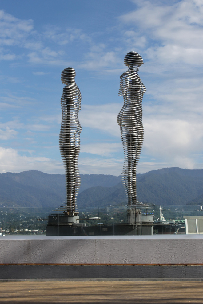 Bức tượng nổi tiếng này có tên là “Ali và Nino”, tọa lạc tại một bãi biển tại thành phố Batumi (Gruzia). Đây được xem là 1 trong 10 tác phẩm điêu khắc lãng mạn nhất thế giới và luôn nằm trong top những điểm đến nổi tiếng nhất quốc gia này theo TripAdvisor. Cặp tình nhân được làm từ thép di động, cao 8m bởi nhà điêu khắc Tamara Kvesitadze. Sau một ngày dài xa cách, cứ đến 7 giờ tối, “Ali và Nino” sẽ nhẹ nhàng chuyển động sát lại quấn quýt lấy nhau, để rồi lại lìa xa nhau ngay sau đó.