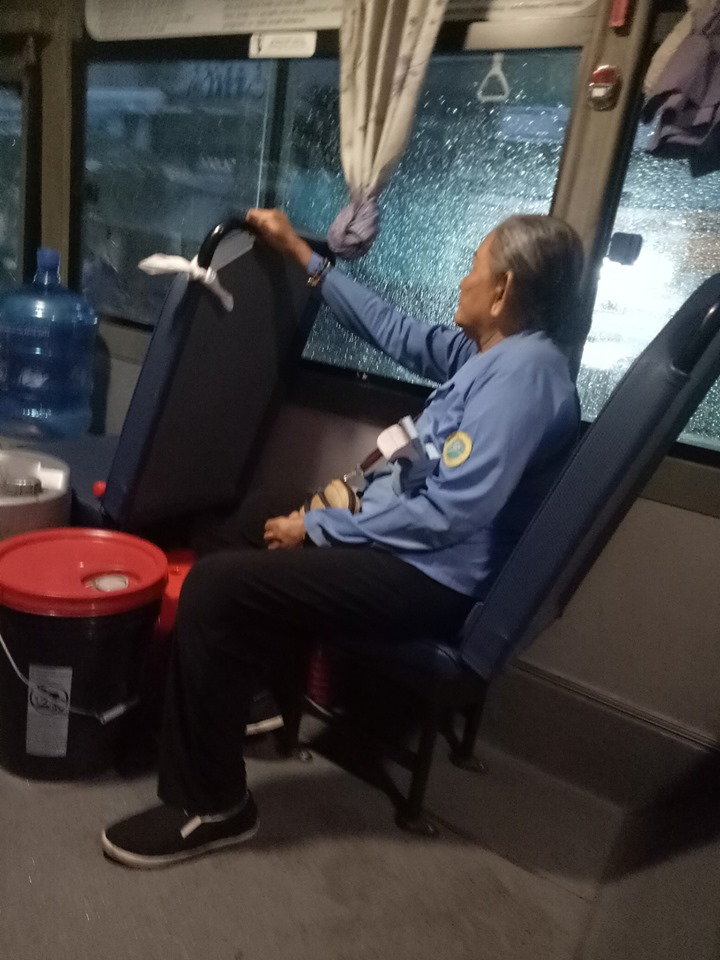 Con vừa lên xe sau một chặng dài nhừ tử từ Long An lên đến Bình Tân, lúc này trời đã bắt đầu mưa tầm tã, cô niềm nở hỏi con có thẻ không, con tìm một hồi chưa thấy thì cô nói được rồi, đưa cô 3 ngàn thôi. Nhìn tóc bạc vậy chứ rất nhanh nhẹn, thấy mưa còn dìu khách lên xuống và trò chuyện rất nhiệt tình.