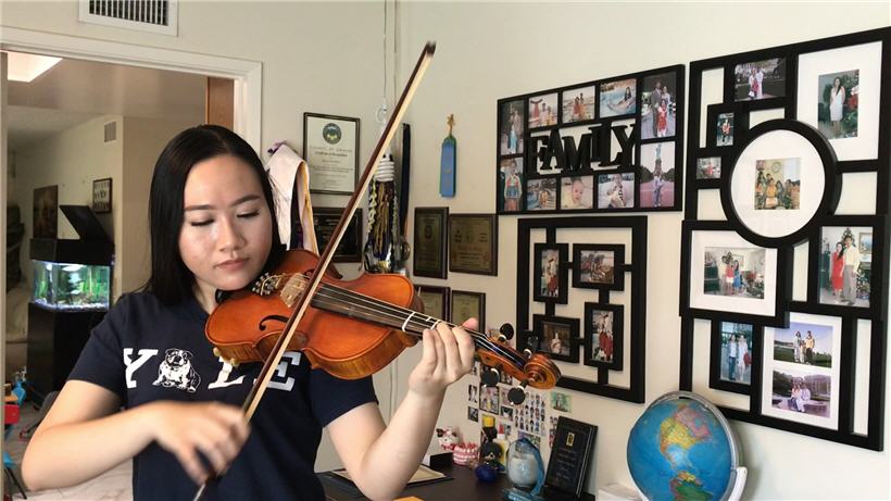 Ngoài piano, Hillary còn chơi được cả đàn violon. (Hình: Thanh Long/Người Việt)