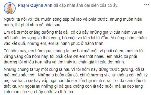 Mới đây, trên trang cá nhân, Phạm Quỳnh Anh đã đăng một bài viết trải lòng về cuộc sống của mình sau gần một năm ly hôn đạo diễn Quang Huy. Nữ ca sĩ viết: “Người ta nói với tôi, muốn sống tiếp thì lao về phía trước, nhưng muốn hiểu mình thì phải nhìn về phía sau. Em đã đi một chặng đường thật dài, có đủ đầy những gia vị của niềm vui và nỗi buồn, hy vọng và thất vọng, bỏ cuộc và làm lại từ đầu. Ai cũng chăm chăm vào kết quả, nhưng em, em lại hạnh phúc ở hành trình.