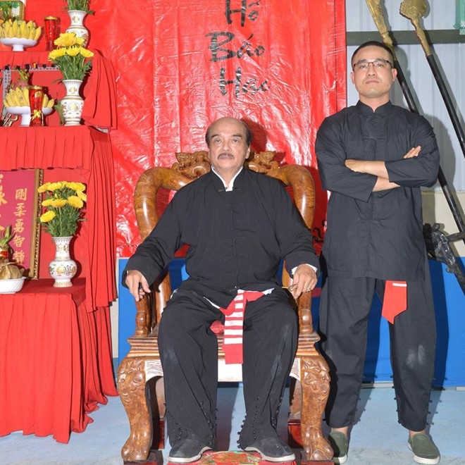 Nam Anh Kiệt (đứng) chụp ảnh cùng đại võ sư Nam Anh. Ảnh: FBNV.