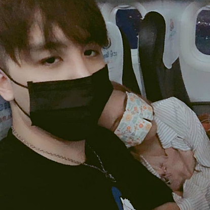 Liu dựa vào vai Xu và ngủ ngon lành trên máy bay. Ảnh: Facebook.