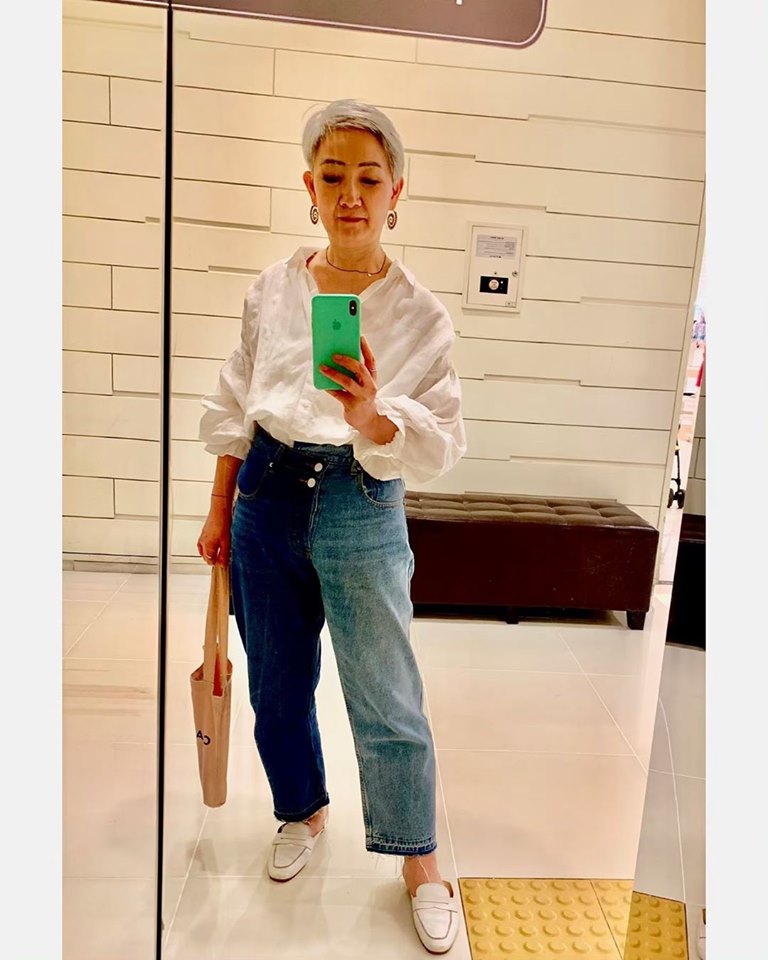 Bà Hyunwoo đam mê các kiểu quần jeans trẻ trung, thậm chí jeans hai màu khó diện thế này bà cũng yêu thích.