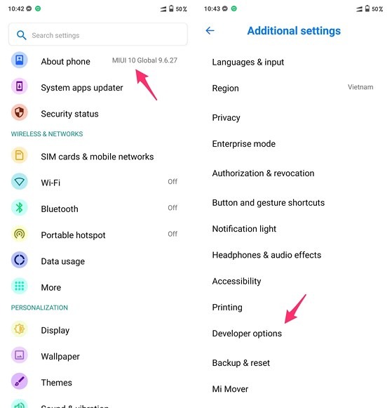 Mặc định, những tính năng này sẽ bị vô hiệu hóa, do đó, bạn cần phải kích hoạt Developer options (tùy chọn nhà phát triển) bằng cách vào Settings (cài đặt) > About phone (thông tin điện thoại), chạm 7 lần vào mục Build number (số hiệu phiên bản) cho đến khi xuất hiện thông báo You're a developer (bạn đã là nhà phát triển). Lưu ý, tên và vị trí các tùy chọn có thể thay đổi tùy vào thiết bị bạn đang sử dụng.